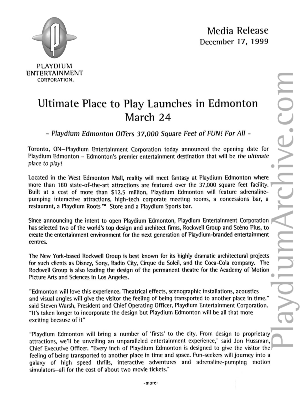 "Edmonton will love this experience. Theatrical effects, scenographic installations, acoustics and visual angles will give the visitor the feeling of being transported to another place in time." said Steven Warsh, President and Chief Operating Officer, Playdium Entertainment Corporation. "It's taken longer to incorporate the design but Playdium Edmonton will be all that more exciting because of it"