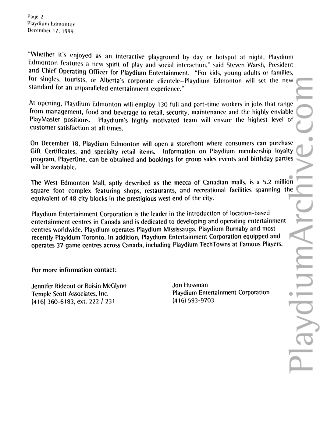 On December 18, Playdium Edmonton will open a storefront where consumers can purchase Gift Certificates, and specialty retail items. information on Playdium membership loyalty program, PlayerOne, can be obtained and bookings for group sales events and birthday parties will be available.